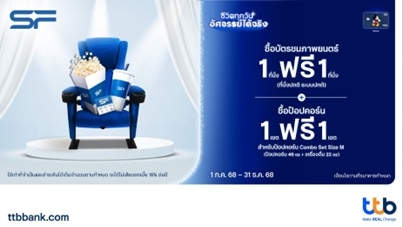 ทีเอ็มบีธนชาต หรือ ทีทีบี ร่วมกับ SF Cinema เชิญชวนคนรักการชมภาพยนตร์มาร่วมสัมผัสประสบการณ์ความคุ้มแบบคูณสอง โดยมอบสิทธิพิเศษเฉพาะผู้ถือบัตรเครดิต ttb Disney คุ้มที่ 1 เพียงซื้อบัตรชมภาพยนตร์จำนวน 1 ที่นั่ง รับฟรี 1 ที่นั่ง (ที่นั่งปกติ ระบบปกติ) ผ่านช่องทางเครื่องจำหน่ายตั๋วอัตโนมัติ Express Ticket, SF Application และ SF Website โดยลูกค้าต้องกดรับสิทธิ์ด้วยตนเองผ่านแอป ttb touch ก่อนชำระเงินผ่านบัตรเครดิต ttb Disney และคุ้มที่ 2 พิเศษมากกว่ารับสิทธิ์อิ่มอร่อยสุดฟิน เมื่อซื้อป๊อปคอร์น Combo Set Size M (ป๊อปคอร์น 46 oz และเครื่องดื่ม 22 oz) จำนวน 1 เซต รับฟรีทันที 1 เซต ตั้งแต่วันที่ 1 กรกฎาคม 2568 – 31 ธันวาคม 2568 ณ โรงภาพยนตร์ในเครือ SF ทุกสาขาทั่วประเทศ ยกเว้น SF Emprivé Cineclub ศึกษารายละเอียดเพิ่มเติมของโปรโมชัน ได้ที่ https://www.ttbbank.com/th/promotion/credit-card/others/ttb-disney-sfcinema-jul25