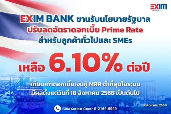 นายบัณฑิต สะเพียรชัย กรรมการ และรักษาการกรรมการผู้จัดการ ธนาคารเพื่อการส่งออกและนำเข้าแห่งประเทศไทย (EXIM BANK) เปิดเผยว่า ตามที่คณะกรรมการนโยบายการเงิน (กนง.) มีมติเป็นเอกฉันท์ให้ปรับลดอัตราดอกเบี้ยนโยบายลงเหลือ 1.50% ต่อปี เพื่อให้ภาวะการเงินเอื้อต่อการปรับตัวของภาคธุรกิจและช่วยบรรเทาภาระของกลุ่มเปราะบาง จากแนวโน้มการชะลอตัวลงของเศรษฐกิจไทย ซึ่งได้รับผลกระทบจากมาตรการภาษีของสหรัฐฯ ดังนั้น เพื่อขานรับนโยบายรัฐบาลในการเพิ่มสภาพคล่องและลดภาระต้นทุนทางการเงินให้กับผู้ประกอบการ โดยเฉพาะลูกค้ากลุ่ม SMEs ของธนาคาร EXIM BANK จึงประกาศปรับลดอัตราดอกเบี้ย Prime Rate เหลือ 6.10% ต่อปี ซึ่งเป็นอัตราดอกเบี้ยเงินกู้ที่ EXIM BANK ใช้สำหรับลูกค้าทั่วไปและลูกค้า SMEs เทียบเท่าอัตราดอกเบี้ยเงินกู้ลูกค้ารายย่อยชั้นดีหรือ MRR ของธนาคารพาณิชย์ นับเป็นอัตราดอกเบี้ยเงินกู้ลูกค้ารายย่อยชั้นดีที่ต่ำที่สุดในระบบ โดยให้มีผลตั้งแต่วันที่ 18 สิงหาคม 2568 เป็นต้นไป