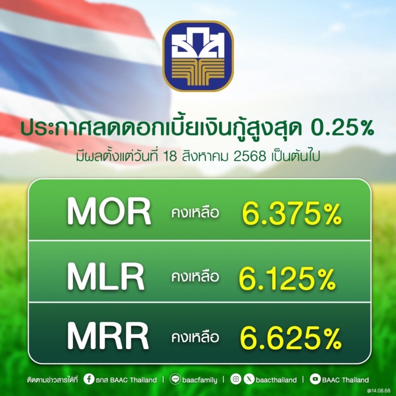 นายฉัตรชัย ศิริไล ผู้จัดการธนาคารเพื่อการเกษตรและสหกรณ์การเกษตร (ธ.ก.ส.) เปิดเผยว่า ตามที่ การประชุมคณะกรรมการนโยบายทางการเงิน (กนง.) เมื่อวันที่ 13 สิงหาคม 2568 มีมติให้ปรับลดอัตราดอกเบี้ยนโยบายลงร้อยละ 0.25 ต่อปี จากร้อยละ 1.75 ต่อปี มาอยู่ที่ร้อยละ 1.50 ต่อปี โดยให้มีผลทันที นั้น ธ.ก.ส. ในฐานะสถาบันการเงินเฉพาะกิจของรัฐ จึงพร้อมปรับลดอัตราดอกเบี้ย เพื่อให้สอดคล้องกับทิศทางอัตราดอกเบี้ยนโยบายและสอดรับกับนโยบายรัฐบาลที่ให้ความสำคัญกับการแก้ไขปัญหาหนี้สินอย่างยั่งยืน ธ.ก.ส. พร้อมช่วยบรรเทาภาระหนี้สินให้กับเกษตรกรลูกค้า รายย่อยและลูกค้ากลุ่มเปราะบาง รวมถึงช่วยลดผลกระทบจากภาษีนำเข้าของสหรัฐอเมริกาให้กับผู้ประกอบการ SME ภาคการเกษตร ให้สามารถฟื้นตัวและดำเนินงานต่อได้ตามปกติในภาวะที่เศรษฐกิจยังเผชิญกับปัจจัยเสี่ยงรอบด้าน ธ.ก.ส. จึงปรับลดอัตราดอกเบี้ยเงินกู้ลงสูงสุดร้อยละ 0.25 ต่อปี ประกอบด้วย อัตราดอกเบี้ยเงินกู้ลูกค้าประเภทเงินเกินบัญชี (MOR) คงเหลือร้อยละ 6.375 ต่อปี อัตราดอกเบี้ยลูกค้านิติบุคคลชั้นดี (MLR) คงเหลือร้อยละ 6.125 ต่อปี และอัตราดอกเบี้ยเงินกู้ลูกค้ารายย่อยชั้นดี (MRR) คงเหลือร้อยละ 6.625 ต่อปี โดยให้มีผลตั้งแต่วันที่ 18 สิงหาคม 2568 เป็นต้นไป