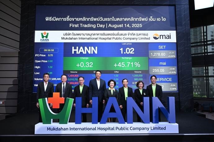 ประพันธ์ เจริญประวัติ ผู้จัดการตลาดหลักทรัพย์ เอ็ม เอ ไอ พร้อมด้วย ประภาศรี สุฉันทบุตร ประธานเจ้าหน้าที่บริหาร บมจ. โรงพยาบาลมุกดาหารอินเตอร์เนชั่นแนล ร่วมพิธีเปิดการซื้อขายวันแรกในตลาดหลักทรัพย์ เอ็ม เอ ไอ ของ บมจ. โรงพยาบาลมุกดาหารอินเตอร์เนชั่นแนล ดำเนินธุรกิจโรงพยาบาลเอกชน 3 แห่ง ในจังหวัดมุกดาหาร และยโสธร ในวันที่ 14 สิงหาคม 2568 มูลค่าหลักทรัพย์ ณ ราคา IPO 392 ล้านบาท โดยใช้ชื่อย่อในการซื้อขายหลักทรัพย์ว่า “HANN”