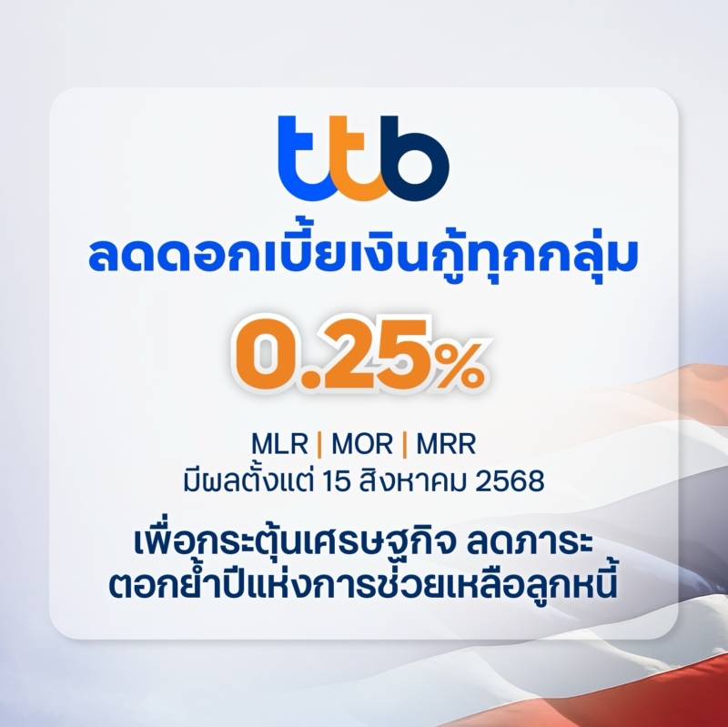 ทีเอ็มบีธนชาต หรือ ทีทีบี ประกาศปรับลดอัตราดอกเบี้ยเงินกู้ทุกกลุ่ม 0.25% ต่อปี โดยมีผลตั้งแต่วันที่ 15 ส.ค. 2568 สอดคล้องกับมติ กนง. ช่วยเพิ่มความผ่อนคลายทางเศรษฐกิจ เอื้อต่อการปรับตัวของภาคธุรกิจและบรรเทาภาระลูกหนี้ ให้สามารถตั้งรับกับสภาพเศรษฐกิจที่ยังมีความไม่แน่นอนสูง จากผลกระทบของนโยบายการค้าโลก ปัญหาสภาพคล่องและภาระหนี้ครัวเรือนที่ยังคงเพิ่มขึ้น