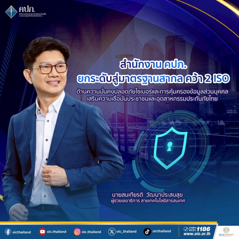 “การรับรองมาตรฐาน ISO/IEC 27001:2022 ครอบคลุม Data Center รวมถึงการบริหารจัดการโครงสร้างพื้นฐาน ความปลอดภัยทางกายภาพ อุปกรณ์รักษาความปลอดภัย และเครือข่าย และระบบศูนย์กลางข้อมูลผู้เอาประกันภัย (IBS Non-Life และ IBS Life) ส่วน ISO/IEC 27701:2019 ครอบคลุมการรับรองระบบการจัดการข้อมูลส่วนบุคคล ซึ่งนำไปใช้กับระบบศูนย์กลางข้อมูลผู้เอาประกันภัย (IBS Non-Life และ IBS Life) ในฐานะผู้ควบคุมข้อมูลส่วนบุคคล (PII Controller) ความสำเร็จในครั้งนี้ ไม่เพียงยกระดับการดำเนินงานภายในของสำนักงาน คปภ. แต่ยังตอกย้ำบทบาทในฐานะองค์กรกำกับดูแลที่มุ่งพัฒนาและส่งเสริมธุรกิจประกันภัยให้เติบโตอย่างยั่งยืน บนพื้นฐานของธรรมาภิบาลและความปลอดภัยทางไซเบอร์” ผู้ช่วยเลขาธิการ สายเทคโนโลยีสารสนเทศ กล่าวในตอนท้าย