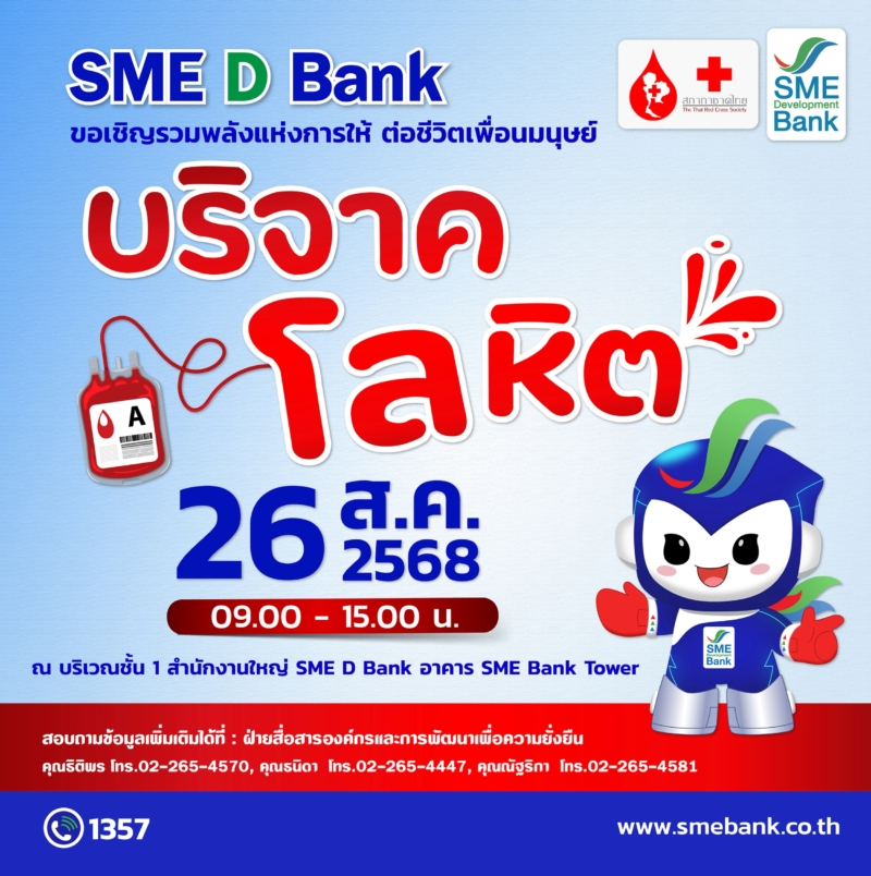 ธนาคารพัฒนาวิสาหกิจขนาดกลางและขนาดย่อมแห่งประเทศไทย (ธพว.) หรือ SME D Bank ร่วมกับ ศูนย์บริการโลหิตแห่งชาติ สภากาชาดไทย เชิญชวนประชาชนผู้มีจิตอาสา ร่วมบริจาคโลหิต ในกิจกรรม “รวมพลังแห่งการให้ ส่งต่อชีวิตเพื่อนมนุษย์” ในวันที่ 26 สิงหาคม 2568 ณ บริเวณชั้น 1 อาคาร SME Bank Tower ตั้งแต่เวลา 09.00-15.00 น. เพื่อเติมเต็มปริมาณสำรองโลหิตให้เพียงพอต่อการรักษาพยาบาลผู้ป่วยทั่วประเทศ ทั้งนี้ การจัดกิจกรรมรับบริจาคโลหิตดังกล่าว เพื่อเฉลิมพระเกียรติและถวายเป็นพระราชกุศล สมเด็จพระนางเจ้าสิริกิติ์ พระบรมราชินีนาถ พระบรมราชชนนีพันปีหลวง เนื่องในโอกาสวันเฉลิมพระชนมพรรษา 12 สิงหาคม 2568 พร้อมทั้งช่วยสร้างประโยชน์แก่สังคม เกิดวัฒนธรรมแห่งการเอื้อเฟื้อแบ่งปันซึ่งกันและกัน นำไปสู่สังคมความแห่งความสุขอย่างยั่งยืน และสอดคล้องตามแนวทาง ESG (Environmental, Social and Governance) โดยกิจกรรมดังกล่าวกำหนดจัดขึ้นเป็นประจำทุกไตรมาส สอบถามข้อมูลเพิ่มเติมได้ที่ ฝ่ายสื่อสารองค์กรและการพัฒนาเพื่อความยั่งยืน โทร. 02-265-4570, 4447, 4581