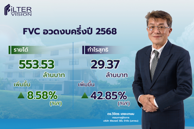 ดร.วิจิตร เตชะเกษม กรรมการผู้จัดการ บริษัท ฟิลเตอร์ วิชั่น จำกัด (มหาชน) “FVC” เปิดเผยว่า ผลการดำเนินงานงวดครึ่งปีแรก ปี 2568 บริษัทฯ มีกำไรสุทธิ เท่ากับ 29.37 ล้านบาท เพิ่มขึ้น 8.81 ล้านบาท หรือคิดเป็นร้อยละ 42.85 เมื่อเทียบกับปีก่อน (YoY) ขณะที่รายได้รวมอยู่ที่ 553.53 ล้านบาท เพิ่มขึ้น 43.76 ล้านบาท หรือคิดเป็นร้อยละ 8.58 (YoY) ซึ่งปัจจัยหลักที่ส่งผลให้บริษัทฯ เติบโตเพิ่มขึ้น มาจากกลุ่มธุรกิจการให้บริการฟอกเลือดด้วยเครื่องไตเทียม ที่หนุนภาพรวมธุรกิจให้โดดเด่น