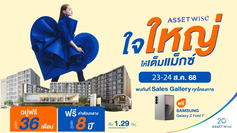 แอสเซทไวส์ จัดแคมเปญ “AssetWise ใจใหญ่ ให้เต็มแม๊กซ์” กระตุ้นดีมานด์คนอยากซื้อคอนโด เปิดดีลเด็ดจองเพียง 999 บาท* อยู่ฟรีสูงสุด 36 เดือน* ฟรีส่วนกลางสูงสุด 8 ปี* ผ่อนต่ำเริ่มล้านละ 2,500 บาท/เดือน สำหรับคอนโดพรีเซลและพร้อมอยู่ 28 โครงการ ทั่วกรุงเทพฯ-ปริมณฑล-EEC ราคาเริ่ม 1.29 ล้านบาท ตั้งแต่วันนี้-30 ก.ย. 68 พิเศษ! จองในงานแจกเพิ่ม Samsung Galaxy Z Fold 7* และ Gift Card มูลค่า 2,000 บาท เฉพาะวันที่ 23-24 ส.ค.68 นี้เท่านั้น