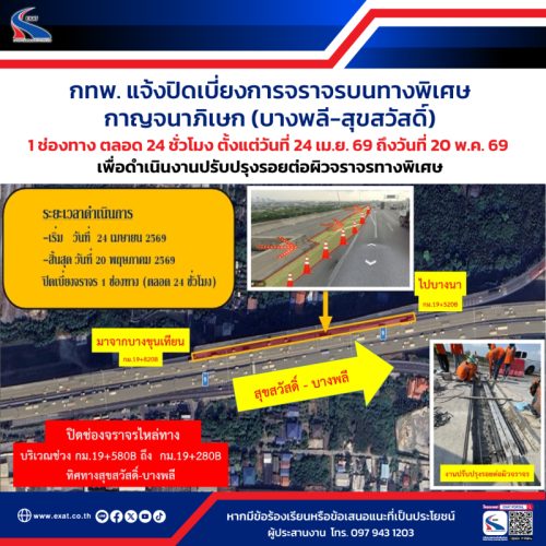กทพ. แจ้งปิดเบี่ยงการจราจรบนทางพิเศษกาญจนาภิเษก (บางพลี-สุขสวัสดิ์) 1 ช่องทาง ตลอด 24 ชั่วโมง