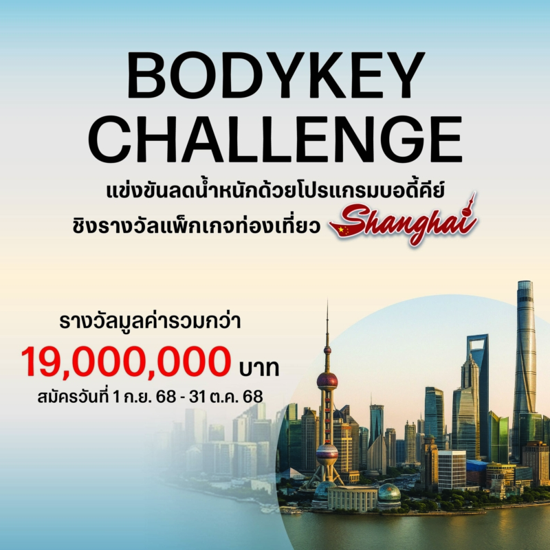 กรุงเทพฯ แอมเวย์ประเทศไทย เอาใจผู้ที่ต้องการใส่ใจตัวเอง จัดแคมเปญการแข่งขัน ลดน้ำหนักครั้งยิ่งใหญ่ กับ “BodyKey Challenge 11th ท้าหุ่นฟิต พิชิตเซี่ยงไฮ้” เชิญชวนผู้ที่สนใจ สมาชิก และนักธุรกิจ แอมเวย์ รวมทีมให้ได้ 4 คน ร่วมสมัครแข่งขันลดน้ำหนัก ชิงรางวัลแพ็กเกจท่องเที่ยวเซี่ยงไฮ้ สาธารณรัฐประชาชนจีน และของรางวัลอื่น ๆ มูลค่ารวมกว่า 19 ล้านบาท โดยผู้ที่สนใจเข้าร่วมกิจกรรม “การแข่งขันลดน้ำหนักด้วยโปรแกรม บอดี้คีย์ ครั้งที่ 11” สามารถลงทะเบียนสมัครได้ตั้งแต่วันที่ 1 กันยายน – 31 ตุลาคม 2568 สามารถศึกษารายละเอียด
