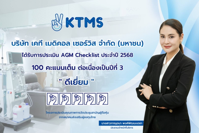 นางสาวกาญจนา พงศ์พัฒนะเดชา ประธานเจ้าหน้าที่บริหาร บริษัท เคที เมดิคอล เซอร์วิส จำกัด (มหาชน) “KTMS” เปิดเผยว่า บริษัทฯ เดินหน้าตอกย้ำความมุ่งมั่นในการบริหารองค์กรสู่ความสำเร็จ ภายใต้การเปิดเผยข้อมูลอย่างครบถ้วน โปร่งใส และการปฏิบัติตามหลักบรรษัทภิบาล (Corporate Governance) อย่างเคร่งครัด โดยล่าสุด ได้รับคะแนนการประเมินคุณภาพการจัดประชุมสามัญผู้ถือหุ้น (AGM Checklist) ประจำปี 2568 ในระดับ “ดีเยี่ยม” ด้วยคะแนนเต็ม 100 คะแนน ต่อเนื่องเป็นปีที่ 3 จากสมาคมส่งเสริมผู้ลงทุนไทย (Thai Investors Association) ร่วมกับ สมาคมบริษัทจดทะเบียน ซึ่งสะท้อนถึงความสำเร็จและความแข็งแกร่งของบริษัทฯ ในการดำเนินธุรกิจอย่างมีจริยธรรม โปร่งใส อีกทั้งสร้างความเชื่อมั่นแก่ผู้ถือหุ้น และนักลงทุนอย่างต่อเนื่อง พร้อมขับเคลื่อนยกระดับการพัฒนาประสิทธิภาพการประชุมเพื่อเสริมความเชื่อมั่นและคุณค่าแก่ผู้มีส่วนได้เสียทุกฝ่าย ซึ่งถือเป็นรากฐานสำคัญในการสร้างความเชื่อมั่นต่อผู้ถือหุ้นและนักลงทุน สู่การเติบโตของธุรกิจอย่างยั่งยืน