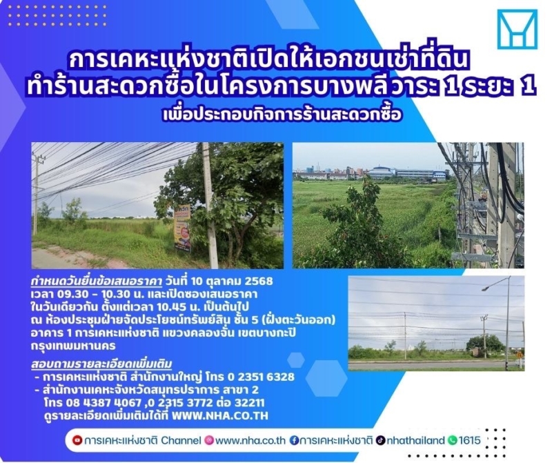 นายอรรคพล ภิรมย์ประดิษฐ์ ผู้อำนวยการฝ่ายจัดประโยชน์ทรัพย์สิน กล่าวว่า การเคหะแห่งชาติเปิดให้เอกชนยื่นข้อเสนอราคาการได้สิทธิเช่าที่ดิน เพื่อประกอบกิจการร้านสะดวกซื้อ พร้อมกิจกรรมต่อเนื่อง ภายในโครงการบางพลี วาระ 1 ระยะ 1 ของโฉนดเลขที่ 31568 ขนาดเนื้อที่ประมาณ 1-0-0 ไร่ เพื่อให้เกิดความโปร่งใสในการดำเนินงานทุกขั้นตอนตามหลักธรรมาภิบาล การเคหะแห่งชาติจึงเปิดโอกาสให้เอกชนที่สนใจสามารถยื่นข้อเสนอราคาการได้สิทธิเช่าที่ดินดังกล่าว โดยมีอัตราค่าธรรมเนียมการได้สิทธิเช่าขั้นต่ำไม่น้อยกว่า 802,000 บาท ระยะเวลาการให้สิทธิเช่า