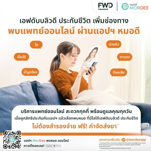 การเพิ่มทางเลือกใหม่ผ่านแอปพลิเคชัน MorDee (หมอดี) จึงเป็นอีกหนึ่งช่องทาง ที่ช่วยให้ลูกค้า FWD สามารถพบแพทย์ออนไลน์ได้อย่างสะดวกสบายจากทุกที่ ซึ่งใช้เวลาในทุกขั้นตอนตั้งแต่ลงทะเบียนจนถึงรับคำปรึกษาในเวลาไม่เกิน 30 นาที (ไม่รวมระยะเวลาจัดส่งยา)