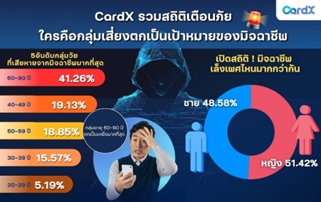 กรุงเทพฯ – จากข้อมูลเชิงสถิติของ CardX พบว่าภาพรวมปัญหามิจฉาชีพที่คุกคามสังคมไทย ตลอดช่วงปี 2024 – มิถุนายน 2025 มีมูลค่าความเสียหายพุ่งสูงกว่า 61.03 ล้านบาท และมีมูลค่าความเสียหายเฉลี่ยต่อเคสสูงถึง 91,500 บาท ซึ่งกว่า 41.26% ของเคสทุจริตทางการเงินที่ตรวจพบ เกิดขึ้นกับกลุ่มลูกค้าในช่วงอายุ 60 ปีขึ้นไป ขณะที่ถัดมากลุ่มวัยทำงานอายุ 40–49 ปี (19.13%) และ 50–59 ปี (18.85%) รวมถึงคนรุ่นใหม่อายุ 30–39 ปี (15.57%) และวัยรุ่นหรือวัยเริ่มทำงานอายุ 20–29 ปี (5.19%) ที่น่าสนใจ หากเจาะลึกในมิติของเพศพบว่า ผู้หญิงตกเป็นเหยื่อมากกว่าผู้ชายเล็กน้อย โดยคิดเป็น 51.42% เทียบกับผู้ชาย 48.58% ซึ่งชี้ให้เห็นว่ามิจฉาชีพสามารถหลอกได้ทั้งเพศหญิงและเพศชายอย่างใกล้เคียงกัน ซึ่งตัวเลขเหล่านี้สะท้อนชัดว่า ภัยมิจฉาชีพไม่ได้เจาะจงเพียงวัยใดวัยหนึ่งหรือเพศใดเพศหนึ่ง แต่สามารถโจมตีได้ทุกเพศ ทุกวัยและทุกกลุ่มประชากรในสังคมไทย
