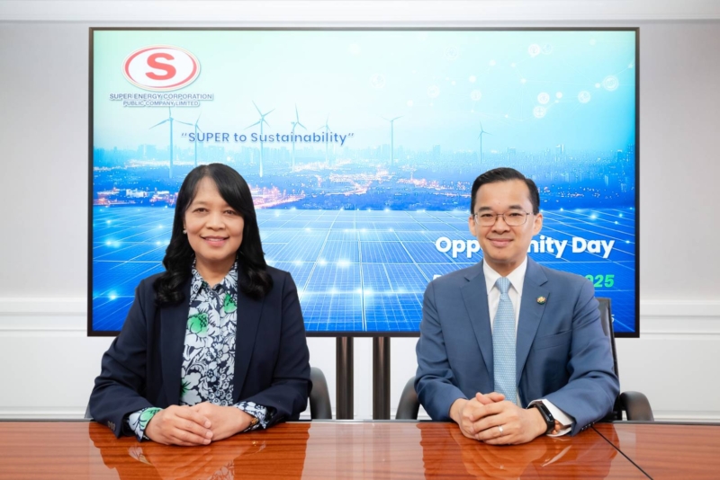 คุณจอมทรัพย์ โลจายะ (ขวา) ประธานเจ้าหน้าที่บริหาร พร้อมด้วย คุณกุลชลี นันทสุขเกษม (ซ้าย) ผู้ช่วยประธานเจ้าหน้าที่บริหาร กลุ่มงานสนับสนุนธุรกิจ บมจ.ซุปเปอร์ เอนเนอร์ยี คอร์เปอเรชั่น (SUPER) ผู้ผลิตและจำหน่ายไฟฟ้าจากพลังงานหมุนเวียน ที่มุ่งเน้นสัมปทานเป็นหลัก ถ่ายภาพร่วมกันภายหลังการนำเสนอข้อมูลสรุปผลการดำเนินงานประจำไตรมาส 2/2568 ในงาน “Opportunity Day” ซึ่งถ่ายทอดผ่านแพลตฟอร์มออนไลน์ของตลาดหลักทรัพย์ฯ โดยในงวด 6 เดือนแรกของปี 2568 กลุ่มบริษัทฯ มีรายได้รวม 4,454.19 ล้านบาท และมี EBITDA จำนวน 3,490.90 ล้านบาท หรือคิดเป็น EBITDA Margin 81% สะท้อนความสามารถการทำกำไรในระดับที่สูง พร้อมระบุถึงทิศทางการดำเนินธุรกิจในช่วงครึ่งหลังปี 2568 คาดว่า มีแนวโน้มสดใสต่อเนื่อง จากปริมาณการผลิตกระแสไฟฟ้าสูงขึ้น การทยอย COD โรงไฟฟ้าในเวียดนาม 2 โครงการ กำลังการผลิตรวม 129 เมกะวัตต์ ในช่วงปลายปี พร้อมย้ำการมีพันธมิตรเป็นโอกาสขยายธุรกิจร่วมกันในอนาคต นอกจากนี้ล่าสุด บริษัทฯ ได้รับคัดเลือกเข้าคำนวณใน FTSE SET Index กลุ่ม Micro Cap โดยงานดังกล่าวจัดขึ้นที่บริษัทฯ เมื่อเร็ว ๆ นี้