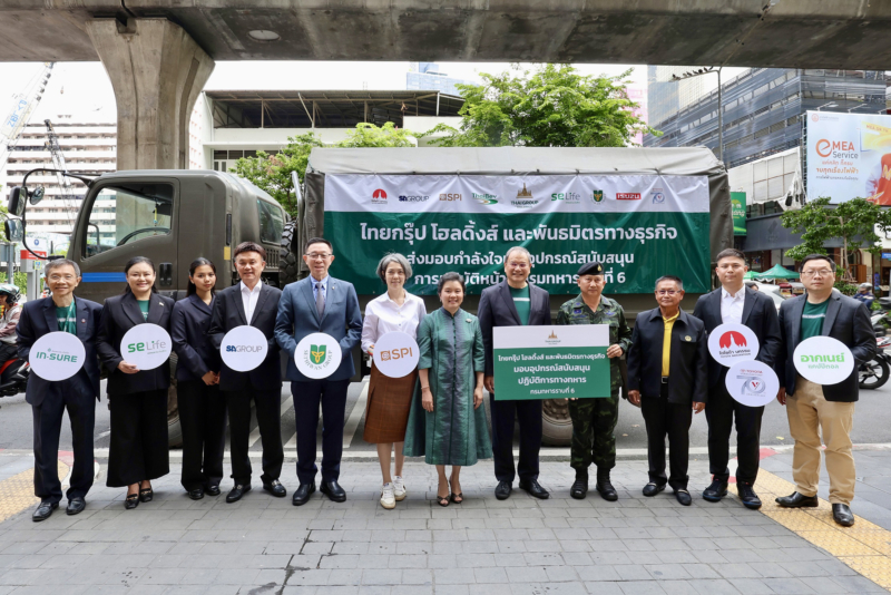 บริษัท ไทยกรุ๊ป โฮลดิ้งส์ จำกัด (มหาชน) กลุ่มธุรกิจประกันและการเงินในเครือทีซีซี จับมือธุรกิจในเครือและพันธมิตรธุรกิจ ได้แก่ บริษัท ไทยเบฟเวอเรจ จำกัด (มหาชน) บริษัท วรจักร์ยนต์ จำกัด บริษัท โตโยต้านครธน จำกัด บริษัท ไทยฟ้า(2511) จำกัด บริษัท เอส.เอ. ไฟเบอร์ จำกัด เครือสหพัฒน์ บริษัท ตรีเพชรอีซูซุเซลส์ จำกัด และบริษัท อาคเนย์ประกันชีวิต จำกัด (มหาชน) ร่วมส่งแรงใจสู่แนวหน้า โดย นายโชติพัฒน์ และนางอาทินันท์ พีชานนท์ ประธานและรองประธานกรรมการบริหาร บริษัท ไทยกรุ๊ป โฮลดิ้งส์ จำกัด (มหาชน) พร้อมด้วยผู้บริหารจากพันธมิตรธุรกิจ มอบอุปกรณ์สนับสนุนการปฏิบัติการทางทหาร ให้แก่ พันเอก ปภังกร หมื่นสา ผู้บังคับการกรมทหารราบที่ 6 ประกอบด้วยเครื่องปั่นไฟ เครื่องสูบน้ำพลังงานโซล่าเซลล์ แผงโซล่าเซลล์ ชุดนอนนาโซล่าเซลล์ ฯลฯ เพื่อเป็นขวัญกำลังใจและสนับสนุนทหารผู้ปฏิบัติหน้าที่ปกป้องอธิปไตยในพื้นที่ชายแดนไทย-กัมพูชา ณ อาคารไทยกรุ๊ป ถนนสีลม เมื่อวันที่ 3 กันยายน 2568