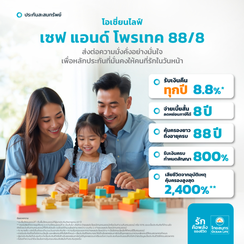 “โอเชี่ยนไลฟ์ เซฟ แอนด์ โพรเทค 88/8” ประกันชีวิตแบบสะสมทรัพย์ที่ได้รับเงินคืนทุกปี 8.8%** จ่ายเบี้ยสั้นเพียง 8 ปี คุ้มครองนานถึงอายุครบ 88 ปี และเมื่อครบกำหนดสัญญารับเงินครบกำหนดสัญญา 800% อีกทั้งยังคุ้มครองกรณีเสียชีวิตจากอุบัติเหตุสูงสุด 2,400%* เบี้ยประกันชีวิตสามารถนำไปอ้างอิงลดหย่อนภาษีเงินได้บุคคลธรรมดาตามหลักเกณฑ์ที่สรรพากรกำหนด รับประกันภัยบุคคลอายุตั้งแต่ 30 วัน – 65 ปี รายละเอียดแบบประกันเพิ่มเติม คลิก https://oceanlifeth.co/Content-Ocean-Save-And-Protect-28-08-68