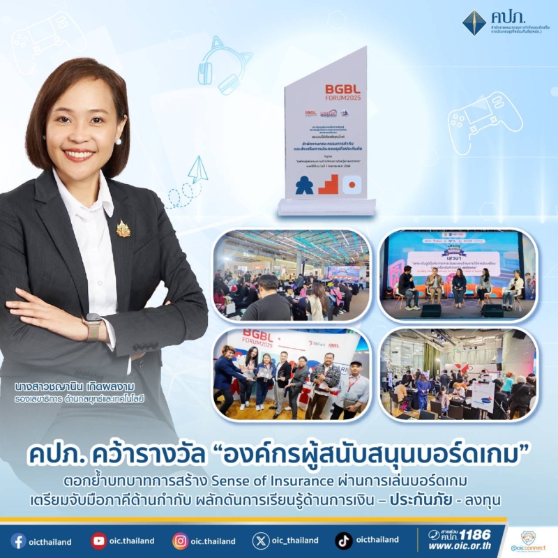 ต่อมาเมื่อวันที่ 7 กันยายน 2568 สำนักงาน คปภ. ขึ้นเวทีรับมอบโล่เกียรติคุณ “องค์กรผู้สนับสนุนการสร้างสังคมแห่งการเรียนรู้ผ่านบอร์ดเกม” ในฐานะองค์กรชั้นนำ ผู้ขับเคลื่อนสังคมแห่งการเรียนรู้ผ่านบอร์ดเกม ซึ่งจัดขึ้นภายในงาน “Board Game-Based Learning Forum 2025” ณ TK Park ชั้น 8 ศูนย์การค้าเซ็นทรัลเวิลด์ โดยพิธีมอบรางวัลได้รับเกียรติจาก คุณวรุตม์ นิมิตยนต์ ผู้อำนวยการสถาบันบอร์ดเกมเพื่อการเรียนรู้ คุณทรงสิทธิ์ แพรเพ็ชร นายกสมาคมผู้ผลิตและออกแบบบอร์ดเกม และ คุณกานต์ มานะแก้ว ผู้แทนจากสมาคมบอร์ดเกมประเทศไทย เป็นผู้มอบโล่รางวัล โดยงานมอบรางวัลครั้งนี้จัดขึ้นเป็นปีแรก มีวัตถุประสงค์เพื่อแสดง ความขอบคุณต่อภาคีเครือข่ายที่ได้นำบอร์ดเกมไปประยุกต์ใช้และผลักดันให้เกิดการยอมรับในหลากหลายมิติ ไม่ว่าจะเป็นการร่วมพัฒนาบอร์ดเกม การจัดประกวดและกิจกรรม Hackathon เพื่อสร้างสรรค์นวัตกรรม ไปจนถึงการออกแบบกิจกรรมการเรียนรู้ในรูปแบบต่าง ๆ ซึ่งความร่วมมือเหล่านี้ ได้ช่วยตอกย้ำว่าบอร์ดเกมคือรูปแบบการเรียนรู้ที่เปิดกว้างต่อผู้คนทุกชนชั้น และเป็นพื้นที่ซึ่งทุกคนสามารถร่วมกันแลกเปลี่ยน เรียนรู้ และเติบโตไปด้วยกัน โดยในปีนี้มีหน่วยงานและองค์กรที่ได้รับการเสนอชื่อเข้ารับรางวัล ทั้งสิ้น 12 แห่ง ได้แก่ กระทรวงวัฒนธรรม ตลาดหลักทรัพย์แห่งประเทศไทย ธนาคารแห่งประเทศไทย สำนักงานคณะกรรมการกำกับและส่งเสริมการประกอบธุรกิจประกันภัย (คปภ.) สำนักงานกองทุนสนับสนุนการสร้างเสริมสุขภาพ (สสส.) สำนักงานกิจการยุติธรรม สถาบันพระปกเกล้า Sea (ประเทศไทย) มูลนิธิฟรีดริช เนามัน ประเทศไทย ศูนย์มานุษยวิทยาสิรินธร (องค์การมหาชน) สำนักงานส่งเสริมเศรษฐกิจสร้างสรรค์ (องค์การมหาชน) และสถาบันอุทยานการเรียนรู้ TK Park