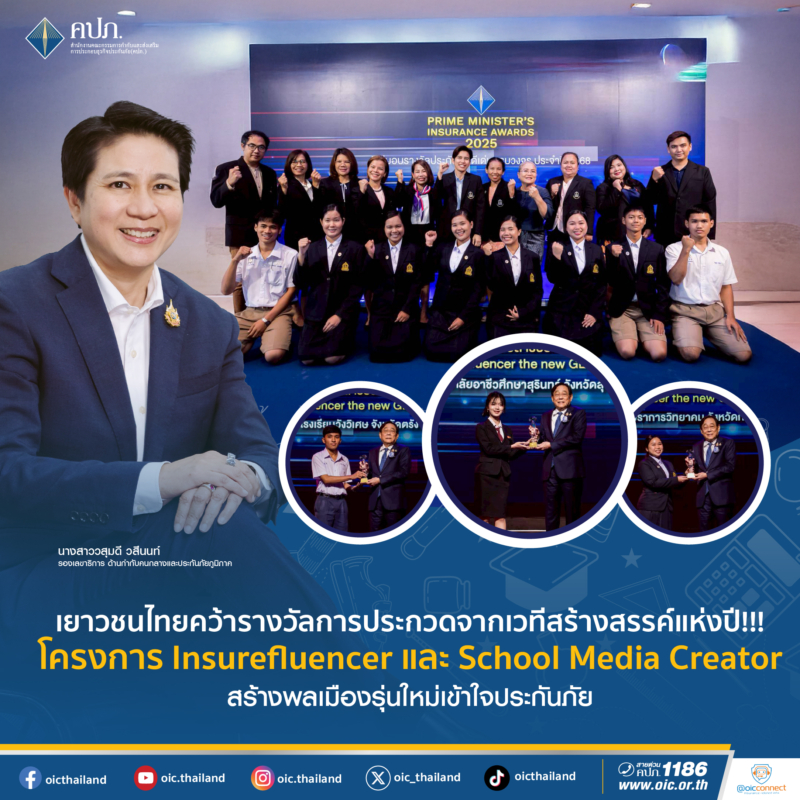 ผลการประกวดยุวชนนักสื่อสารประกันภัยรุ่นใหม่ ปี 2568 “Insurefluencer the new GEN 2025” รางวัลชนะเลิศระดับประเทศ ได้แก่ โรงเรียนวชิรปราการวิทยาคม จังหวัดกำแพงเพชร (ทุนพัฒนาการศึกษา 80,000 บาท พร้อมโล่รางวัลและ e-Certificate) รองชนะเลิศอันดับ 1 ได้แก่ โรงเรียนวังวิเศษ จังหวัดตรัง (ทุนพัฒนาการศึกษา 60,000 บาท พร้อมโล่รางวัลและ e-Certificate) และรองชนะเลิศอันดับ 2 วิทยาลัยอาชีวศึกษาสุรินทร์ จังหวัดสุรินทร์ ทุนพัฒนาการศึกษา 40,000 บาท พร้อมโล่รางวัลและ e-Certificate) สำหรับผลการประกวดสื่อสร้างสรรค์ School Media Creator Award รางวัลขวัญใจวัย GEN ได้แก่ โรงเรียนอำนาจเจริญ จังหวัดอำนาจเจริญ ชื่อผลงาน “การทำประกันภัยมันดีอย่างไรกันนะ!” รางวัลความคิดสร้างสรรค์ ได้แก่ โรงเรียนสิเกาประชาผดุงวิทย์ จังหวัดตรัง ชื่อผลงาน “หนีเสือปะประกันภัย” รางวัลสื่อสารเพื่อสังคม ได้แก่ โรงเรียนยโสธรพิทยาคม จังหวัดยโสธร ชื่อผลงาน “ภัยร้ายนายประกัน” รางวัลเนื้อหายอดเยี่ยม ได้แก่ โรงเรียนเตรียมอุดมศึกษา ภาคตะวันออกเฉียงเหนือ จังหวัดสกลนคร ชื่อผลงาน “คนตรงกลางที่ห่วงใย คนตรงใจที่ห่วงเธอ” และรางวัลนำเสนอดีเด่น ได้แก่ โรงเรียนกุยบุรีวิทยา จังหวัดประจวบคีรีขันธ์ ชื่อผลงาน “ประกันชีวิตของแม่…” ทั้งนี้ โรงเรียนที่คว้ารางวัลชนะเลิศและรองชนะเลิศ ในการประกวดยุวชนนักสื่อสารประกันภัยรุ่นใหม่ ปี 2568 “Insurefluencer the new GEN 2025” เข้ารับโล่รางวัลระดับประเทศ เมื่อวันที่ 5 กันยายน 2568 จากนายพิชัย ชุณหวชิร รองนายกรัฐมนตรีและรัฐมนตรีว่าการกระทรวงการคลัง ในงานพิธีมอบรางวัลประกันภัยดีเด่นครบวงจร (Prime Minister’s Insurance Awards 2025) ณ ห้องบางกอกคอนเวนชัน เซ็นเตอร์ เอวัน โรงแรม เซ็นทาราแกรนด์ และบางกอกคอนเวนชันเซ็นเตอร์ เซ็นทรัลเวิลด์ โดยสามารถรับชมผลงานแต่ละประเภทรางวัลได้ที่ช่องทาง YouTube : สํานักงาน คปภ. oic thailand