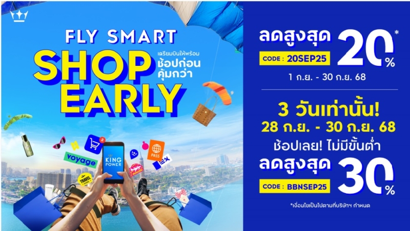 คิง เพาเวอร์ ออนไลน์ จัดแคมเปญเอาใจนักเดินทาง “Fly Smart, Shop Early – เตรียมบินให้พร้อม ช้อปก่อนคุ้มกว่า!” พบกับสินค้าจากแบรนด์ชั้นนำระดับโลก อาทิ MCM, POLO RALPH LAUREN, FERRAGAMO, TUMI, SAINT LAURENT, LACOSTE, COCCINELLE, MARC JACOBS และอีกมากมาย รับส่วนลดสูงสุด 20% เมื่อช้อปครบ 7,000 บาทขึ้นไป เพียงใส่รหัส 20SEP25 ช้อปคุ้มถูกใจ ตั้งแต่วันนี้ – 30 กันยายน 2568