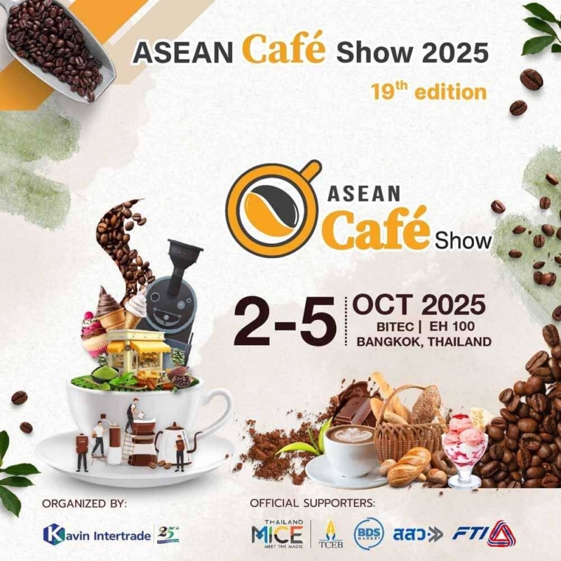 บริษัท กวิน อินเตอร์เทรด จำกัด เดินหน้าจัดงาน ASEAN Café Show 2025 แสดงสินค้าเพื่อธุรกิจคาเฟ่ครบวงจร ครั้งที่ 19 เพื่อตอบรับกระแสพฤติกรรมการบริโภคกาแฟในไทยซึ่งเฉลี่ยมากกว่า 340 แก้วต่อคนต่อปี โดยจับมือผู้ประกอบการชั้นนำทั้งไทยและต่างประเทศกว่า 150 บริษัท นำเสนอสินค้าและบริการด้วยแนวคิด “Taste the Trends” พร้อมกิจกรรมกว่า 40 รายการ ระหว่างวันที่ 2–5 ตุลาคม 2568 ณ ฮอลล์ 100 ศูนย์นิทรรศการและการประชุม ไบเทค บางนา คาดมีผู้เข้าชมราว 20,000 คน และเกิดเม็ดเงินสะพัดกว่า 700 ล้านบาท