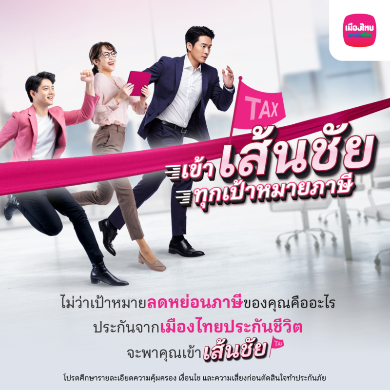 ล่าสุดเมืองไทยประกันชีวิต เปิดตัวแคมเปญ เข้า “เส้นชัย” ทุกเป้าหมายภาษี ด้วยแบบประกัน ที่ตอบโจทย์ด้านการวางแผนลดหย่อนภาษี ที่เข้าถึงได้ทุกไลฟ์สไตล์ของลูกค้า แม้เป้าหมายต่างกัน ก็สามารถเข้าเส้นชัยลดหย่อนภาษีได้เหมือนกัน ทั้งผู้ที่เป็นมือใหม่หัดลดหย่อน เป้าหมายอยากเริ่มต้นวางแผนภาษี แต่ยังไม่มีความรู้และไม่รู้จะเริ่มตรงไหน กลัวซับซ้อน และอยากได้คำแนะนำที่เข้าใจง่าย หรือมือโปร นักวางแผนภาษีตัวจริง ที่มีการวางแผนลดหย่อนภาษีเป็นประจำอยู่แล้วในทุกปี มองหาตัวช่วย เพื่อเปรียบเทียบให้การวางแผนให้คุ้มค่ามากขึ้น และได้ผลตอบแทนที่เหมาะสมกับเป้าหมาย