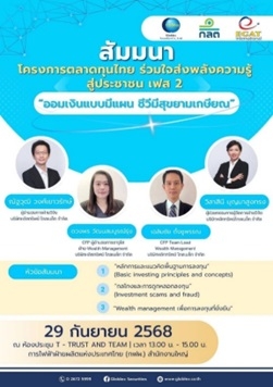 บริษัทหลักทรัพย์ โกลเบล็ก จำกัด (GBS) ขานรับนโยบายสำนักงานคณะกรรมการกำกับหลักทรัพย์และตลาดหลักทรัพย์ (ก.ล.ต.) ภายใต้โครงการตลาดทุนไทย ร่วมใจส่งพลังความรู้ สู่ประชาชน เฟส 2 โดยบล.โกลเบล็ก ได้จัดทำสัมมนาขึ้นในหัวข้อ “ออมเงินแบบมีแผน ชีวีมีสุขยามเกษียณ” เพื่อส่งเสริมความรู้ด้านการเงินและการลงทุนให้แก่ประชาชน พร้อมเสริมทักษะการบริหารจัดการเงินอย่างมีประสิทธิภาพ ล่าสุด บล.โกลเบล็ก จัดกระบวนทัพนำทีมกูรู ด้านการลงทุน อาทิ วิลาสินี บุญมาสูงทรง ผู้ช่วยกรรมการผู้จัดการ, ณัฐวุฒิ วงศ์เยาวรักษ์ ผู้อำนวยการฝ่ายวิจัย, ดวงพร วัฒนสมบูรณ์รุ่ง ผู้อำนวยการอาวุโส ฝ่าย Wealth Management และ เฉลิมชัย ตั้งชูพรรณ Team Lead Wealth Management จะมาให้ความรู้กับทีมผู้บริหาร และ พนักงานการไฟฟ้าฝ่ายผลิตแห่งประเทศไทย (กฟผ.) ได้เข้าใจถึงการลงทุน และวิธีการออมที่ถูกต้องและมีแบบแผน รวมถึงการรับมือจากภัยการลงทุนต่อกรณีสถานการณ์ที่อาจเข้าข่ายถูกหลอกลวงลงทุนและมีภูมิคุ้มกันจากภัยกลโกงรูปแบบต่าง ๆ โดยงานดังกล่าวจะจัดขึ้น วันที่ 29 กันยายน 2568 เวลา13.00-15.00 น. ณ ห้องประชุม T-Trust and Team กฟผ.สำนักงานใหญ่
