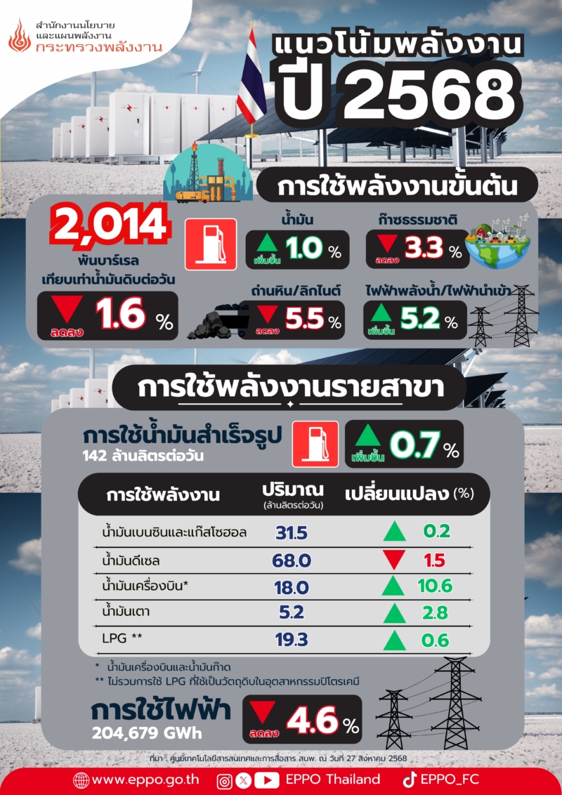 นายวัฒนพงษ์ คุโรวาท ผู้อำนวยการสำนักงานนโยบายและแผนพลังงาน (สนพ.) เปิดเผยถึงสถานการณ์พลังงาน 6 เดือนแรกของปี 2568 ว่าการใช้พลังงานขั้นต้นลดลงร้อยละ 2.5 เทียบกับช่วงเดียวกัน ของปีก่อน โดยเป็นการลดลงของการใช้ถ่านหินและก๊าซธรรมชาติ ในขณะที่การใช้น้ำมัน ลิกไนต์ และไฟฟ้า พลังน้ำ/ไฟฟ้านำเข้า มีการใช้เพิ่มขึ้น ทั้งนี้ การใช้น้ำมันสำเร็จรูปเพิ่มขึ้นร้อยละ 1.6 จากการใช้น้ำมันเบนซิน แก๊สโซฮอล น้ำมันเตา และก๊าซปิโตรเลียมเหลว (LPG) ยกเว้น น้ำมันดีเซล ในขณะที่การใช้น้ำมันเครื่องบินเพิ่มขึ้นร้อยละ 10.9 สอดคล้องกับสถิติจำนวนผู้เยี่ยมเยือนที่เพิ่มขึ้นเมื่อเทียบกับช่วงเดียวกันของปีก่อน ในส่วนของการใช้ไฟฟ้าลดลงร้อยละ 5.5 โดยมาจากการใช้ไฟฟ้าในส่วนอุตสาหกรรม ครัวเรือน ธุรกิจ