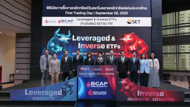 ดร. รินใจ ชาครพิพัฒน์ รองผู้จัดการ หัวหน้าสายงานการตลาด ตลาดหลักทรัพย์ฯ พร้อมด้วย เมธ์วดี ประเสริฐสินธนา กรรมการผู้จัดการ บลจ. บางกอกแคปปิตอล จำกัด และ ชัยพร น้อมพิทักษ์เจริญ กรรมการผู้จัดการ กิจการค้าหลักทรัพย์ บล. บัวหลวง จำกัด (มหาชน) ร่วมพิธีเปิดการซื้อขายวันแรกในตลาดหลักทรัพย์ฯ ของกองทุน Leveraged & Inverse ETF ได้แก่ “2X01BSET50”, “2I01BSET50”, “1I01BSET50” จำนวน 3 กองทุน ที่อ้างอิงดัชนี SET50 TRI ในวันที่ 26 ก.ย. 2568 ทั้งนี้ Leveraged ETF จะเป็น ETF ที่ให้ผลตอบแทนไปทางเดียวกับดัชนีอ้างอิง เหมาะกับกรณีที่คาดว่าตลาดจะมีแนวโน้มเป็นขาขึ้น ส่วน Inverse ETF จะเป็น ETF ที่ให้ผลตอบแทนไปทางตรงข้ามกับดัชนีอ้างอิง เหมาะกับกรณีที่คาดว่าทิศทางตลาดจะปรับลง