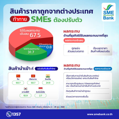 ขณะที่ ดัชนีความเชื่อมั่นของผู้ประกอบการเอสเอ็มอี ไตรมาส 3/68 อยู่ระดับ 67.1 ปรับเพิ่มขึ้นจากไตรมาสก่อน (2/2568 ระดับ 57.3) เนื่องจากได้แรงส่งจากโครงการ “เที่ยวไทยคนละครึ่ง ปี 68” ส่งผลให้จำนวนคำสั่งซื้อ/การให้บริการ และผลประกอบการขยับสูงขึ้น โดยเฉพาะกลุ่มผู้ประกอบการขนาดย่อย (Micro) มีความเชื่อมั่นสูงขึ้นกว่ากลุ่มอื่น เพราะได้รับอานิสงส์จากกำลังซื้อภายในประเทศ เกิดการกระจายรายได้สู่กลุ่ม Micro มากขึ้น สอดคล้องกับธุรกิจ บริการท่องเที่ยว ที่โดดเด่นที่สุดเมื่อเทียบกับสาขาอื่น อย่างไรก็ตาม ผู้ประกอบการส่วนใหญ่ ยังมีความกังวลเรื่องการทะลักเข้ามาของสินค้าราคาถูก จากจีน เวียดนาม และอินเดีย กระทบต่อการดำเนินธุรกิจจากการถูกแย่งส่วนแบ่งตลาด และต้องลดราคาสินค้า เพื่อแข่งขัน