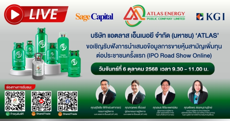 เตรียมพบกับผู้บริหารมากประสบการณ์ในธุรกิจก๊าซ LPG ครอบคลุมทั้งภาคขนส่ง ครัวเรือน และอุตสาหกรรม ภายใต้แบรนด์ PT อย่าง “สุวัชชัย พิทักษ์วงศาภรณ์ ” กรรมการผู้จัดการ และ “กฤตพร พึ่งวงษ์ ”ผู้ช่วยกรรมการผู้จัดการ บมจ.แอตลาส เอ็นเนอยี (ATLAS) พร้อมให้ข้อมูลการระดมทุนและเข้าจดทะเบียนในตลาดหลักทรัพย์แห่งประเทศไทย (SET) …งานนี้ ไม่ได้มาเล่นๆ เพราะมีทั้ง “อมร พิริยะแพทย์สม” ผู้ช่วยกรรมการผู้จัดการ บริษัท เซจแคปปิตอล จำกัด ในฐานะที่ปรึกษาทางการเงิน ผนึกกำลังกับโบรกเกอร์มือทอง “พัชพร สรรคบุรานุรักษ์” กรรมการผู้จัดการ ฝ่ายวาณิชธนกิจ1 บริษัทหลักทรัพย์ เคจีไอ (ประเทศไทย) จำกัด (มหาชน) ในฐานะผู้จัดการการจัดจำหน่าย และรับประกันการจำหน่ายหุ้น IPO ลุยเสิร์ฟข้อมูลเด็ด…แบบจัดเต็ม พร้อมชูจุดเด่นเน้นการจำหน่ายก๊าซ LPG แบบค้าปลีก แล้วยังมีรายได้จาก Taxi Ads เป็นแรงหนุน ดันมาร์จิ้น พุ่งสูง! ก่อนเสนอขาย จำนวน 418.42 ล้านหุ้น ในงานโรดโชว์บนแพลตฟอร์มออนไลน์วันที่ 6 ต.ค.นี้ เวลา 09.30 -11.00 น. ผ่านช่องทางเพจ Facebook ก๊าซหุงต้มพีที หรือ www.facebook.com/PTCookingGas และทาง Facebook , YouTube ของ Share2Trade แฟนคลับหุ้นไอพีโอห้ามพลาดคร้า!!!