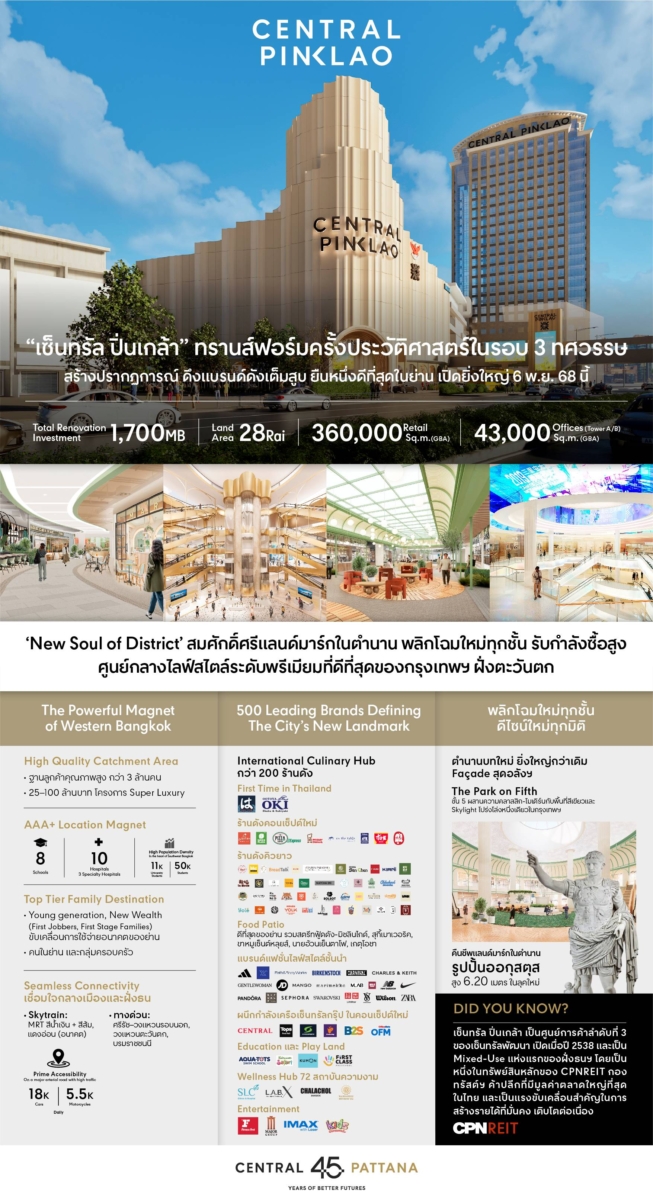 กรุงเทพฯ – เซ็นทรัล ปิ่นเกล้า ศูนย์การค้าลำดับที่ 3 ที่ประสบความสำเร็จมาตลอด 30 ปีของ บริษัท เซ็นทรัลพัฒนา จำกัด (มหาชน) เตรียมสร้างปรากฏการณ์ใหม่ให้วงการรีเทลไทยยิ่งใหญ่กว่าเดิม ทุ่มงบกว่า 1,700 ล้านบาท ทรานส์ฟอร์มศูนย์การค้าใหม่ทั้งหมดในรอบ 3 ทศวรรษ ด้วยคอนเซ็ปต์ “New Soul of the District” แลนด์มาร์กศูนย์กลางไลฟ์สไตล์ระดับพรีเมียมที่ดีที่สุดของกรุงเทพฯ ฝั่งตะวันตก บนพื้นที่กว่า 360,000 ตร.ม. (GBA) ตอบกลุ่มกำลังซื้อสูงทุกเจเนอเรชันด้วย Brand Magnet เพียบ คัดสรรมาแล้วกว่า 500 แบรนด์ และแบรนด์ใหม่ในกระแสกว่า 150 แบรนด์ ครบทุกไลฟ์สไตล์ พร้อมสะกดทุกสายตาด้วย Façade ลายเส้นภายนอกดีไซน์คลาสสิก-โมเดิร์น ภายในถ่ายทอดความสง่างามและพลังสร้างสรรค์ พร้อมเผยโฉมยิ่งใหญ่เต็มรูปแบบในวันที่ 6 พ.ย. 2568 นี้ คาดดึง Quality traffic เพิ่มกว่า 25-30%
