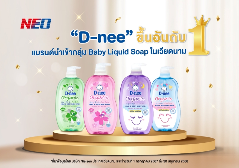 บริษัท นีโอ คอร์ปอเรท จำกัด (มหาชน) หรือ NEO ประกาศความสำเร็จครั้งสำคัญของแบรนด์ “D-nee” (ดีนี่) ในตลาดเวียดนาม โดยสบู่เหลวเด็กดีนี่มีการเติบโตถึง 369% นับจากเข้าไปทำการตลาดอย่างจริงจังในปี 2565 โดยครองตำแหน่งแบรนด์นำเข้าอันดับ 1 และติด Top 5 ของตลาดสบู่เหลวสำหรับเด็ก ด้วยส่วนแบ่งการตลาด 8.6% และตั้งเป้าติด Top 3 ในปี 2569