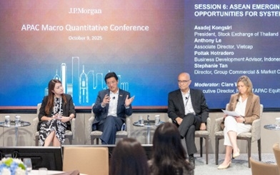 อัสสเดช คงสิริ กรรมการและผู้จัดการ ตลาดหลักทรัพย์แห่งประเทศไทย ร่วมเสวนาในหัวข้อ “ASEAN Emerging Market Liquidity and Considerations for Systematic Trading” พร้อมด้วยผู้บริหารระดับสูงจากตลาดหลักทรัพย์ในภูมิภาคอาเซียน ภายในงาน APAC Macro Quantitative Conference ที่จัดโดย J.P. Morgan เพื่อแลกเปลี่ยนมุมมองเกี่ยวกับแนวโน้มสภาพคล่องในตลาดเกิดใหม่ การพัฒนาโครงสร้างตลาดและเทคโนโลยี รวมถึงบทบาทของตลาดหลักทรัพย์ในการเสริมสร้างความเชื่อมั่นและความยั่งยืนของตลาดทุนอาเซียน โดยมีผู้จัดการกองทุนเข้าร่วมงานมากกว่า 100 ราย ณ เขตบริหารพิเศษฮ่องกง เมื่อวันที่ 9 ตุลาคม 2568