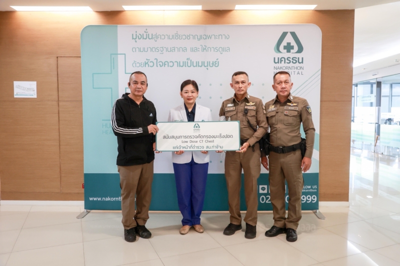 บมจ.โรงพยาบาลนครธน (NKT) แสดงความห่วงใยต่อสุขภาพของเจ้าหน้าที่ตำรวจจราจร สถานีตำรวจนครบาลท่าข้าม โดย แพทย์หญิงศิเรมอร ทองสิมา (ที่ 2 จากซ้าย) ผู้อำนวยการสายงานแพทย์ โรงพยาบาลนครธน เป็นผู้แทนมอบโปรแกรมตรวจสุขภาพปอดให้แก่ตำรวจจราจร จำนวน 25 นาย โดยมี พันตำรวจโทอิทธิพันธ์ หาญเวช สารวัตรจราจร สน.ท่าข้าม (ที่ 1 จากซ้าย) ให้เกียรติรับมอบ กิจกรรมดังกล่าวจัดขึ้นเพื่อส่งเสริมสุขภาพและป้องกันโรคระบบทางเดินหายใจในกลุ่มเจ้าหน้าที่ซึ่งต้องปฏิบัติงานกลางสภาพแวดล้อมที่มีมลพิษจากควันรถยนต์ โดยโปรแกรมตรวจสุขภาพปอดประกอบด้วย การตรวจสมรรถภาพปอด การเอกซเรย์ปอด (Chest X-ray) และการตรวจคัดกรองมะเร็งปอดด้วยเอกซเรย์คอมพิวเตอร์แบบรังสีต่ำ (Low Dose CT Chest) โรงพยาบาลนครธนมุ่งมั่นสนับสนุนการดูแลสุขภาพของบุคลากรผู้เสียสละเพื่อสังคม และหวังให้ตำรวจจราจรทุกท่านมีสุขภาพร่างกายแข็งแรง พร้อมให้บริการประชาชนอย่างปลอดภัยและยั่งยืนต่อไป