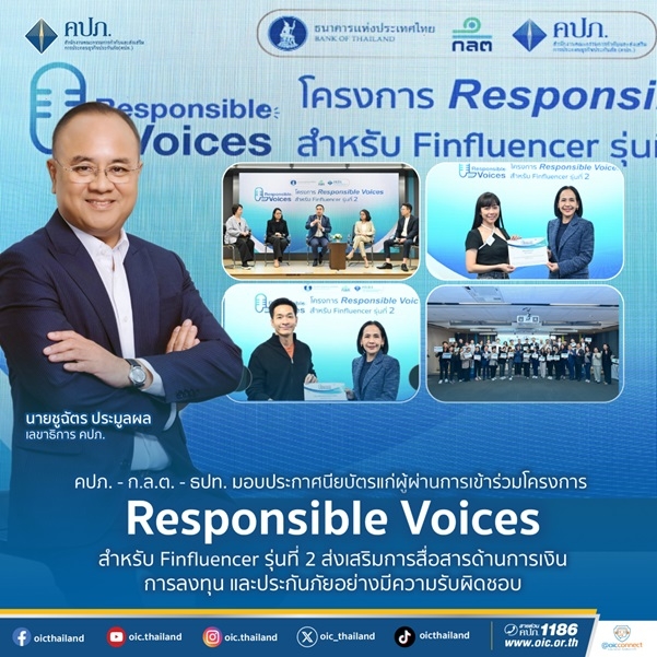 โดยในช่วงของพิธีมอบประกาศนียบัตรแก่ผู้ผ่านการอบรมโครงการ “Responsible Voices สำหรับ Finfluencer รุ่นที่ 2” ได้รับเกียรติจากศาสตราจารย์ ดร.พรอนงค์ บุษราตระกูล เลขาธิการ ก.ล.ต. เป็นประธานมอบประกาศนียบัตรและกล่าวแสดง ความยินดีแก่ Finfluencer รุ่นที่ 2 ที่ผ่านการอบรมจำนวน 38 ราย จาก 32 ช่อง พร้อมเน้นย้ำถึงความสำคัญของการสื่อสารด้านการเงิน การลงทุน และประกันภัยอย่างมีความรับผิดชอบในยุคดิจิทัล โดยมุ่งเน้นการเสริมสร้างความรู้ ความเข้าใจเกี่ยวกับ แนวทางการเผยแพร่ข้อมูลต่อผู้ติดตามอย่างถูกต้อง เหมาะสม และตระหนักถึงบทบาทของตนในฐานะผู้สร้างสรรค์คอนเทนต์ ทางการเงินที่มีจริยธรรม ผ่านรูปแบบการบรรยายและกิจกรรม Workshop จากผู้เชี่ยวชาญของทั้งสามหน่วยงานกำกับดูแล สะท้อนให้เห็นถึงพลังของผู้สร้างคอนเทนต์รุ่นใหม่ ในการใช้สื่อดิจิทัลเผยแพร่ข้อมูลด้านการเงิน การลงทุน และประกันภัยอย่าง มีความรับผิดชอบ อันสอดคล้องกับพันธกิจของสำนักงาน คปภ. ในการคุ้มครองผู้ทำประกันภัย และส่งเสริมความรู้ความเข้าใจ ด้านประกันภัยอย่างยั่งยืน