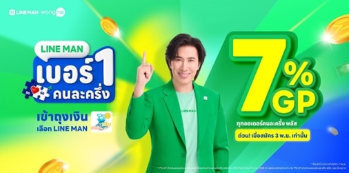 - รับ 7% GP สำหรับออเดอร์คนละครึ่งพลัส เมื่อสมัครเข้าร่วมโครงการกับ LINE MAN ในวันที่ 3 พฤศจิกายน 2568 หรือรับ 9% GP สำหรับออเดอร์คนละครึ่งพลัส ที่สมัครเข้าร่วมโครงการหลังวันดังกล่าวจนจบโครงการ