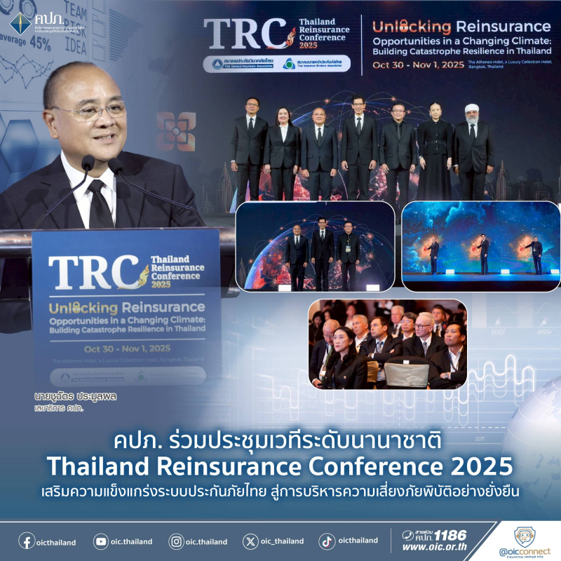 เมื่อวันที่ 30 ตุลาคม 2568 สำนักงานคณะกรรมการกำกับและส่งเสริมการประกอบธุรกิจประกันภัย (สำนักงาน คปภ.) เข้าร่วมการประชุม Thailand Reinsurance Conference (TRC) 2025 ซึ่งถือเป็นงานประชุมด้านประกันภัยต่อที่ยิ่งใหญ่ที่สุดแห่งปี จัดโดยสมาคมประกันวินาศภัยไทยร่วมกับสมาคมนายหน้าประกันภัยไทย ภายใต้แนวคิด “Unlocking Reinsurance Opportunities in a Changing Climate : Building Catastrophe Resilience in Thailand” โดยมีวัตถุประสงค์เพื่อเป็นเวทีแลกเปลี่ยนองค์ความรู้และมุมมองจากผู้เชี่ยวชาญระดับนานาชาติ