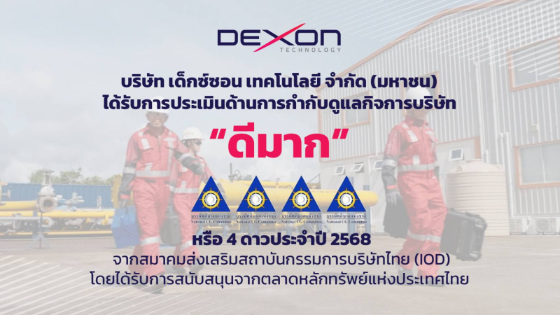 บริษัท เด็กซ์ซอน เทคโนโลยี จำกัด (มหาชน) หรือ DEXON ผู้ให้บริการตรวจสอบทางวิศวกรรมและสร้างนวัตกรรมทางเทคโนโลยี สำหรับตรวจสอบโครงสร้างและอุปกรณ์การผลิตในอุตสาหกรรม ได้รับการประเมินผลการกำกับดูแลกิจการในระดับ 4 ดาว หรือ “ดีมาก” จากโครงการสำรวจการกำกับดูแลกิจการของบริษัทจดทะเบียนไทย ประจำปี 2568 (Corporate Governance Report of Thai Listed Companies: CGR 2025) ซึ่งจัดโดยสมาคมส่งเสริมสถาบันกรรมการบริษัทไทย (IOD) โดยได้รับการสนับสนุนจากตลาดหลักทรัพย์แห่งประเทศไทย (SET) และสำนักงานคณะกรรมการกำกับหลักทรัพย์และตลาดหลักทรัพย์ (ก.ล.ต.)