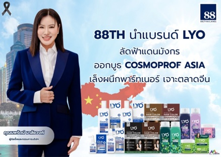 กรุงเทพฯ – บมจ. 88(ไทยแลนด์) “88TH” บินลัดฟ้าบุกแดนมังกร นำผลิตภัณฑ์ภายใต้ แบรนด์ “LYO” ร่วมออกบูธงาน “COSMOPROF ASIA 2025 ที่ฮ่องกง” พร้อมเตรียมผนึกพาร์ทเนอร์จีน เพิ่มช่องทางขยายตลาดเพิ่ม ชี้ดีมานด์ผู้บริโภคชาวจีนให้ความสำคัญการดูแลเส้นผม โดยเฉพาะผลิตภัณฑ์ที่ทำมาจากสมุนไพร มั่นใจหนุนยอดขาย “LYO” เติบโตต่อเนื่อง
