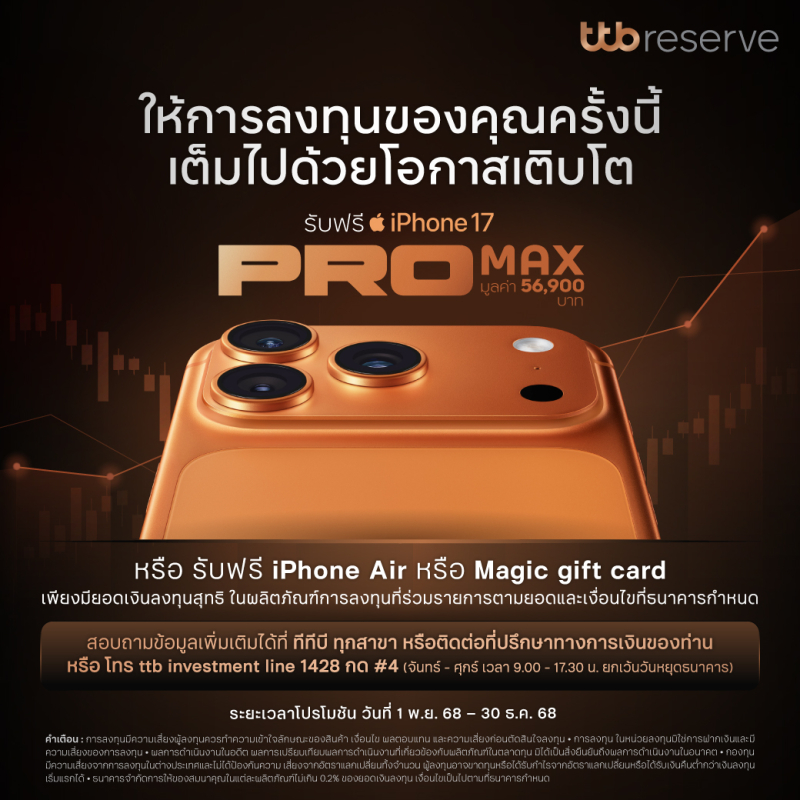 - ลงทุนสุทธิตั้งแต่ 60,000,000 บาทขึ้นไป รับ iPhone 17 Pro Max 512GB สี Cosmic Orange มูลค่า 56,900 บาท
