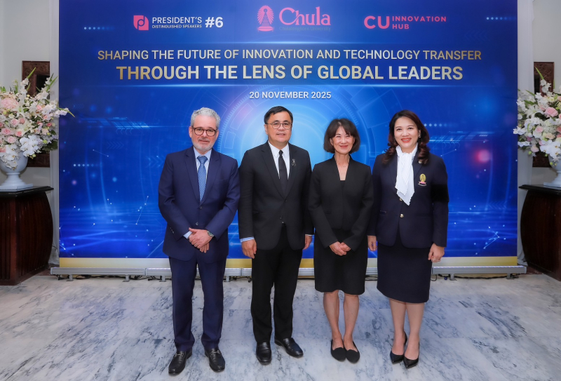 จุฬาลงกรณ์มหาวิทยาลัย ร่วมกับศูนย์กลางนวัตกรรมแห่งจุฬาลงกรณ์มหาวิทยาลัย (CU Innovation Hub) เดินหน้ายกระดับศักยภาพนวัตกรรมและทรัพย์สินทางปัญญาของประเทศ ผ่านการจัดงานเสวนา President’s Distinguished Speaker ครั้งที่ 6 “ก้าวสู่อนาคตของนวัตกรรมและการถ่ายทอดเทคโนโลยีผ่านมุมมองของผู้นำระดับโลก” โดยได้รับเกียรติจาก ศาสตราจารย์ ดร.วิเลิศ ภูริวัชร อธิการบดีจุฬาฯ กล่าวเปิดงาน จากนั้นเป็นการปาฐกถาจากผู้นำระดับโลกด้านทรัพย์สินทางปัญญา นวัตกรรมและการถ่ายทอดเทคโนโลยี คุณ Marco M. Alemán ผู้ช่วยอธิบดีองค์การทรัพย์สินทางปัญญาโลก (WIPO) และคุณ Katharine Ku อดีตผู้อำนวยการฝ่ายบริหารจาก Office of Technology Licensing จาก Stanford University มีคุณอรมน ทรัพย์ทวีธรรม อธิบดีกรมทรัพย์สินทางปัญญา พร้อมด้วยผู้บริหารมหาวิทยาลัย ผู้ทรงคุณวุฒิจากภาครัฐ และผู้บริหารระดับสูงจากภาคเอกชน มาเข้าร่วมเพื่อร่วมยกระดับผลงานวิจัยและทรัพย์สินทางปัญญาไทยสู่ตลาดโลกอย่างคับคั่ง