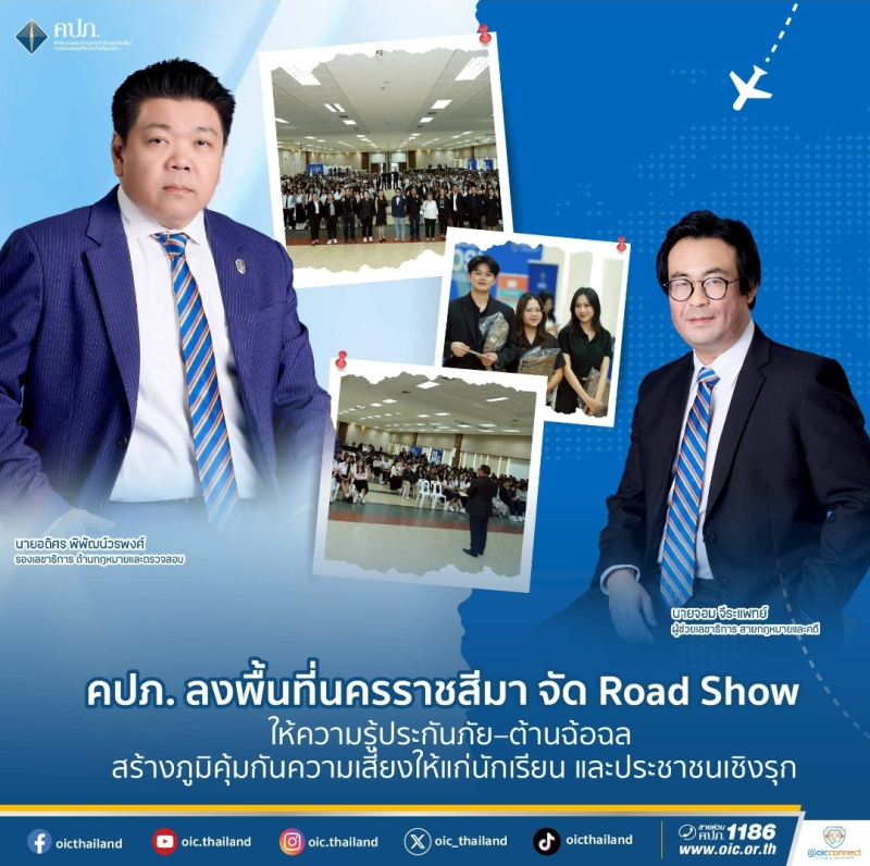 นายอดิศร พิพัฒน์วรพงศ์ รองเลขาธิการ ด้านกฎหมายและตรวจสอบ สำนักงานคณะกรรมการกำกับและส่ งเสริมการประกอบธุรกิจประกันภัย (สำนักงาน คปภ.) มอบหมายให้ นางสาววิไลพร เจียรกิตติวงศ์ ผู้อำนวยการฝ่ายอาวุโส ฝ่ายวางแผนและพัฒนากฎหมาย เป็นผู้แทนเปิดงาน โครงการ Road Show ให้ความรู้ด้านการประกันภั ยและการฉ้อฉลประกันภัย สำหรับผู้ประกอบการ SMEs และประชาชนเชิงรุก ซึ่งจัดโดย สายกฎหมายและคดี เพื่อเสริมสร้างความรู้ความเข้ าใจเกี่ยวกับหลักการประกันภัย สิทธิประโยชน์ตามกฎหมาย และการป้องกันความเสี่ ยงจากการฉ้อฉลประกันภัย ตลอดจนส่งเสริมให้ เยาวชนและประชาชนสามารถใช้ประกั นภัยเป็นเครื่องมือบริ หารความเสี่ยงได้อย่างถูกต้อง เมื่อวันที่ 12 พฤศจิกายน 2568 ณ โรงเรียนสุรธรรมพิทักษ์ จังหวัดนครราชสีมา