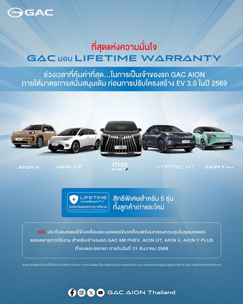 GAC AION Thailand ประกาศมอบสิทธิ์ “Lifetime Warranty” ให้กับรถยนต์ รุ่น GAC HYPTEC HT, GAC M8 PHEV, GAC AION V, GAC AION UT และ GAC AION Y Plus เพื่อขอบคุณทุกความไว้วางใจและสร้างความเชื่อมั่นสูงสุดแก่ลูกค้าชาวไทย