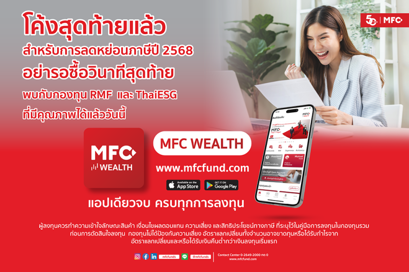 สำหรับนักลงทุนที่ซื้อกองทุนภาษี RMF, ThaiESG ที่ร่วมรายการกับ MFC ทุก 50,000 บาท รับกองทุนพันธบัตรรัฐบาล MMGOVMF มูลค่า100 บาท ตั้งแต่วันนี้ – 30 ธ.ค. 68 เท่านั้น ทั้งนี้ ผู้ลงทุนควรทำความเข้าใจลักษณะสินค้า เงื่อนไขผลตอบแทน ความเสี่ยงและสิทธิประโยชน์ทางภาษีที่ระบุไว้ในคู่มือการลงทุนในกองทุนรวมก่อนการตัดสินใจลงทุน ผู้ที่สนใจสอบถามข้อมูลได้ที่ บลจ. เอ็มเอฟซี โทร. 0-2649-2000 ติดต่อฝ่ายวางแผนการลงทุน กด 2 หรือ Contact Center กด 0 สาขาแจ้งวัฒนะ โทร. 0-2835-3055-57 สาขาปิ่นเกล้า โทร. 0-2014-3150-2 สาขาขอนแก่น โทร. 043-204-014-16 สาขาเชียงใหม่ โทร.0-5321-8480-82 สาขาระยอง โทร. 033-100-340 สาขาหาดใหญ่ โทร. 074-232-324–25 หรือศึกษาข้อมูลเพิ่มเติมได้ที่ www.mfcfund.com