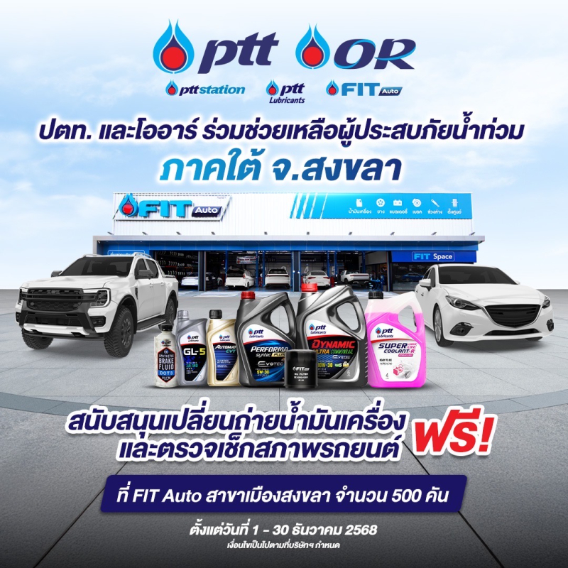 ส่วนบริการสำหรับรถยนต์ จะเปิดให้บริการเปลี่ยนถ่ายน้ำมันเครื่อง จำนวน 500 คัน ณ ศูนย์บริการยานยนต์ FIT Auto สาขาเมืองสงขลา โดยมีทีมช่างผู้เชี่ยวชาญให้บริการตรวจเช็ก ซ่อมบำรุง เปลี่ยนถ่ายน้ำมันเครื่องและของเหลวอื่นๆ และให้คำแนะนำเกี่ยวกับการใช้งานรถหลังผ่านเหตุอุทกภัย เพื่อช่วยให้ประชาชนกลับมาใช้ยานพาหนะได้อย่างปลอดภัยและมั่นใจ นอกจากนี้ โออาร์ ยังจัดตั้งศูนย์ช่วยเหลือ 5 จุด เพื่อเป็นจุดพักพิงและส่งต่อความช่วยเหลือ รวมทั้งเป็นจุดบริการในการตรวจสอบและซ่อมแซมถังและเตาก๊าซแอลพีจี (LPG) ในครัวเรือนที่ได้รับความเสียหาย พร้อมเร่งฟื้นฟู สถานีบริการ พีทีที สเตชั่น ที่ได้รับผลกระทบจากอุทกภัยเพื่อให้กลับมาเปิดให้บริการโดยเร็วที่สุด
