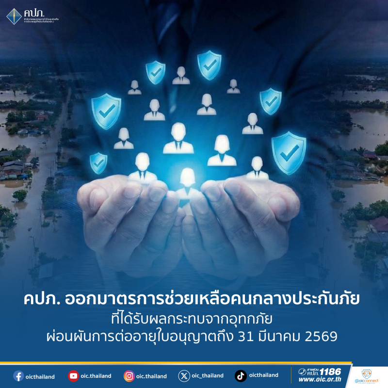 สำนักงานคณะกรรมการกำกับและส่งเสริมการประกอบธุรกิจประกันภัย (สำนักงาน คปภ.) ตระหนักถึงผลกระทบจากสถานการณ์อุทกภัยที่เกิดขึ้นในหลายพื้นที่ทั่วประเทศ โดยเฉพาะในช่วงปลายปีซึ่งเป็นฤดูมรสุมของภาคใต้ และยังเป็นช่วง High Season ของธุรกรรมด้านประกันภัย อาจส่งผลให้ตัวแทนประกันภัยและนายหน้าประกันภัยไม่สามารถเข้ารับการอบรมหรือต่ออายุใบอนุญาตได้ภายในเวลาที่กำหนด