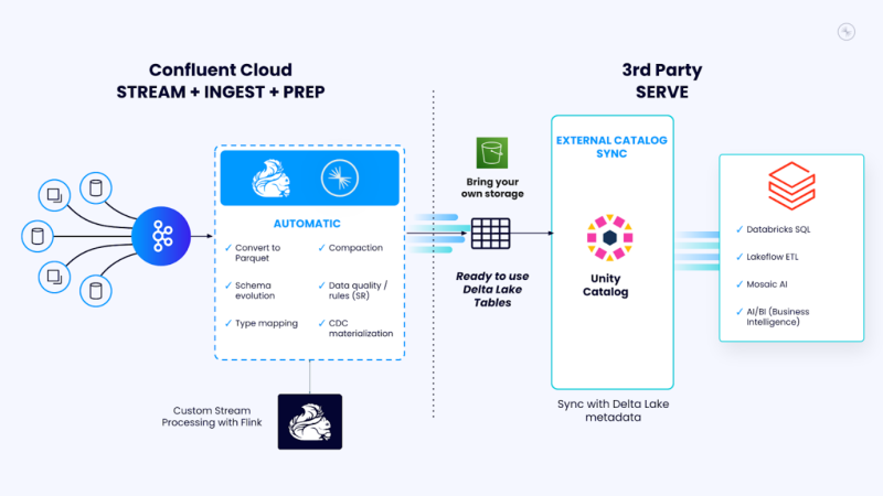 - รวมศูนย์การกำกับดูแลข้อมูล: การรองรับ Unity Catalog (GA) จะทำให้การเชื่อมต่อเมตาดาต้า (Metadata) สคีมา (Schema) และนโยบายการเข้าถึงข้อมูลระหว่าง Tableflow และ Databricks Unity Catalog เกิดขึ้นได้โดยอัตโนมัติ เพื่อให้การกำกับดูแลและการจัดการข้อมูลเป็นไปในทิศทางเดียวกัน และสอดคล้องกันทั่วทั้งองค์กร