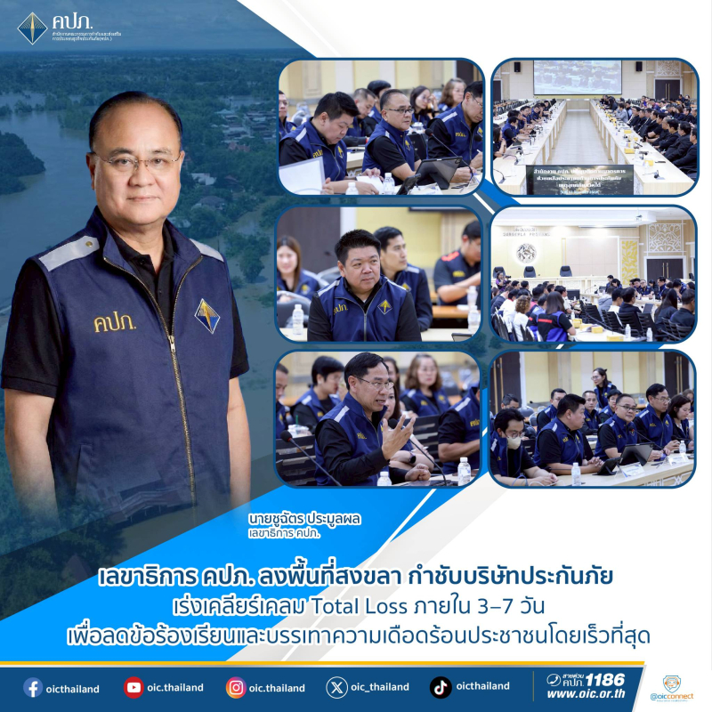 สำนักงาน คปภ. ยังได้ทุ่มเทสรรพกำลังอย่างเต็มที่ในการขับเคลื่อนมาตรการช่วยเหลือครั้งนี้ และเน้นย้ำให้ ภาคธุรกิจประกันภัยดำเนินงานเชิงรุก เพื่อดูแลประชาชนในทุกขั้นตอนของการให้ความช่วยเหลือ โดยเฉพาะการเร่งรัดการ จ่ายค่าสินไหมทดแทนให้รวดเร็ว โปร่งใส และเป็นธรรม พร้อมจัดส่งทีมคุ้มครองสิทธิประโยชน์จากส่วนกลางลงพื้นที่ เพื่อสนับสนุนการทำงานของสำนักงาน คปภ. ภาค 9 (สงขลา) และบูรณาการร่วมกับบริษัทประกันภัยและหน่วยงานที่เกี่ยวข้องอย่างใกล้ชิด เพื่อเร่งรัดการแก้ไขปัญหาและให้ความช่วยเหลือประชาชนในพื้นที่โดยเร็วที่สุด และขอแสดงความห่วงใย ต่อประชาชนที่ได้รับผลกระทบจากอุทกภัยในครั้งนี้ พร้อมขอย้ำว่ามาตรการต่าง ๆ ที่ดำเนินการอยู่มีเป้าหมายเพื่อให้ประชาชนได้รับการฟื้นฟูและเยียวยาอย่างรวดเร็ว ทั่วถึง และเป็นธรรม พร้อมทั้งกำกับติดตามการปฏิบัติงานของบริษัทประกันภัยทุกแห่งอย่างใกล้ชิด เพื่อให้มาตรการทุกด้านเกิดผลอย่างเป็นรูปธรรมและสามารถบรรเทาความเดือดร้อนของประชาชนได้อย่างแท้จริง สะท้อนความมุ่งมั่นของสำนักงาน คปภ. ในการยืนหยัดเคียงข้างประชาชนในทุกสถานการณ์ ทั้งนี้ หากประชาชนมีข้อสงสัย หรือพบปัญหาเกี่ยวกับการประกันภัย สามารถติดต่อ สายด่วน คปภ. 1186 ได้ตลอด 24 ชั่วโมง