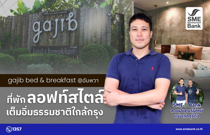 สูดลมหายใจให้เต็มปอด ท่ามกลางธรรมชาติอันเงียบสงบ หลบความวุ่นวายจากเมืองใหญ่ แล้วมาเอนกายพักผ่อนในที่พักสไตล์ลอฟท์ ในบรรยากาศสวน ณ อ.บางคนที จ.สมุทรสงคราม เมืองรองใกล้กรุงเทพฯ ที่นี่คือ “กระจิบ เบด แอนด์ เบรคฟาสต์” (Gajib bed and breakfast) สถานที่พักและคาเฟ่ ที่มี “คุณเพชร ศรฤทธิ์ชิงชัย” คนรุ่นใหม่เป็นเจ้าของกิจการ โดยมี SME D Bank ธนาคารเพื่อเอสเอ็มอีไทย เติมทุนเสริมช่วยแจ้งเกิดธุรกิจ และคอยเคียงข้างตลอดเส้นทางที่ผ่านมา สนับสนุนให้สถานที่แห่งนี้ พร้อมต้อนรับนักท่องเที่ยวทั้งชาวไทยและต่างชาติ ให้ได้มาชาร์จพลัง เติมความสดชื่น และสัมผัสความผ่อนคลายได้เสมอ