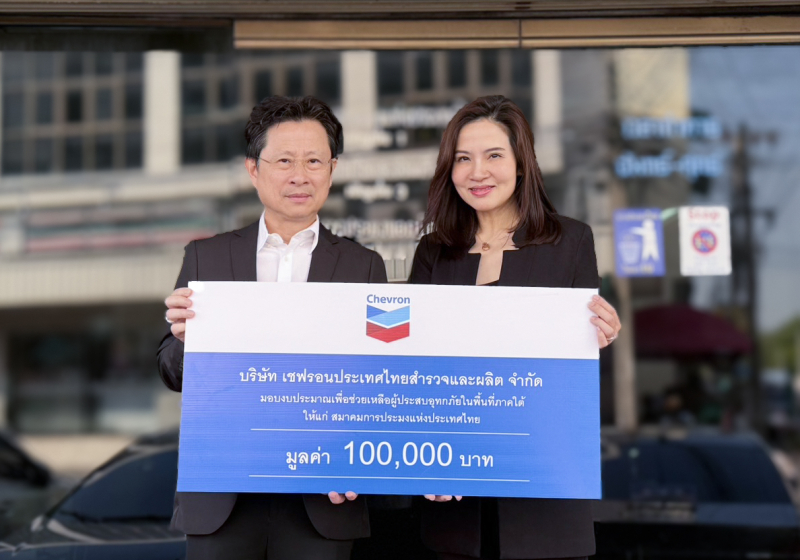 เมื่อเร็วๆ นี้ บริษัท เชฟรอนประเทศไทยสำรวจและผลิต จำกัด นำโดย นางทิพย์วดี ไทยศิริ ผู้จัดการฝ่ายรัฐกิจ (ขวา) ได้ส่งมอบงบประมาณจำนวน 100,000 บาท แก่สมาคมการประมงแห่งประเทศไทย โดยมี นายมงคล สุขเจริญคณา ประธานสมาคมการประมงแห่งประเทศไทย (ซ้าย) เป็นตัวแทนรับมอบ เพื่อสนับสนุนภารกิจช่วยเหลือผู้ประสบอุทกภัยในพื้นที่ภาคใต้