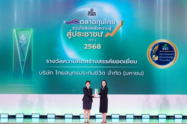 OCEAN LIFE ไทยสมุทรประกันชีวิต โดย คุณสุวรรณ อุดมเฉลิมเดช Deputy Chief Executive Officer and Acting Chief Investment Officer (CIO) ร้บรางวัล “ความคิดสร้างสรรค์ยอดเยี่ยม” (Creativity Award) จาก สำนักงานคณะกรรมการกำกับหลักทรัพย์และตลาดหลักทรัพย์ (สำนักงาน ก.ล.ต.) ในโครงการ “ตลาดทุนไทยร่วมใจส่งพลังความรู้ สู่ประชาชน เฟส 2 ปี 2568 ซึ่งเป็นรางวัลสำหรับผู้ประกอบธุรกิจที่มีการให้ความรู้การเงินการลงทุนที่สามารถทำให้คนจดจำได้ง่าย นำไปสู่การช่วยให้เกิดการปรับเปลี่ยนพฤติกรรมของกลุ่มเป้าหมาย และ/หรือ มีการประยุกต์ใช้เทคโนโลยีมาประกอบการให้ความรู้ได้อย่างสร้างสรรค์ ซึ่งสามารถนำไปปฏิบัติให้เกิดผลต่อกลุ่มเป้าหมายอย่างเป็นรูปธรรม