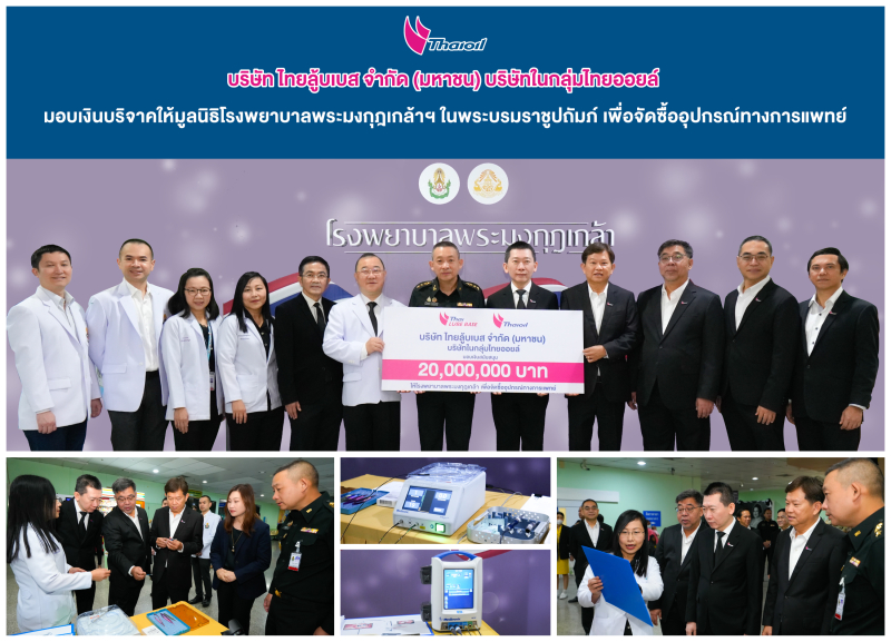 คุณบัณฑิต ธรรมประจำจิต ประธานเจ้าหน้าที่บริหารและกรรมการผู้จัดการใหญ่ บริษัท ไทยออยล์ จำกัด (มหาชน) และ คุณสันติ วาสนสิริ กรรมการอำนวยการ บริษัท ไทยลู้บเบส จำกัด (มหาชน) บริจาคเงินจำนวน 20 ล้านบาท ให้แก่มูลนิธิโรงพยาบาลพระมงกุฎเกล้า ในพระบรมราชูปถัมภ์ โดยมี พันเอก อดิสรณ์ ลำเพาพงศ์ รองผู้อำนวยการโรงพยาบาลพระมงกุฎเกล้า เป็นผู้รับมอบ ณ ห้องประชุมติณสูลานนท์ อาคารเฉลิมพระเกียรติ โรงพยาบาลพระมงกุฎเกล้า